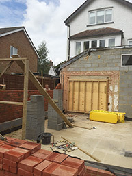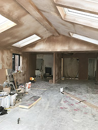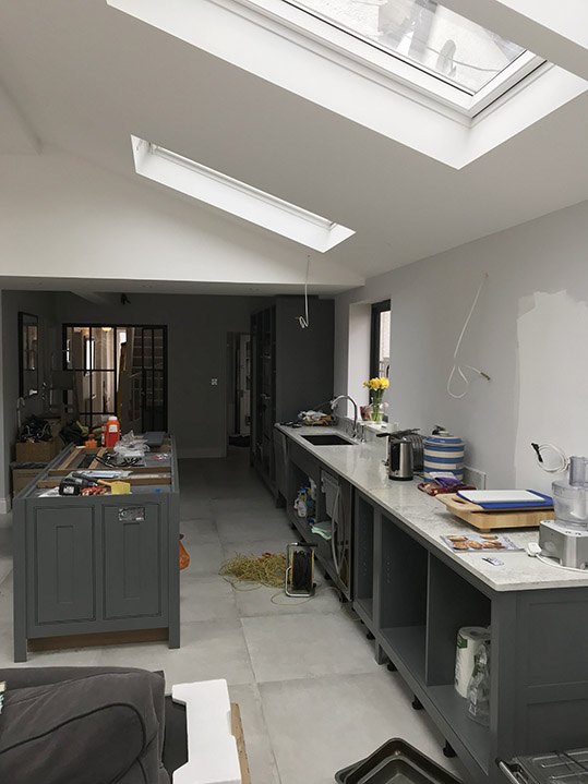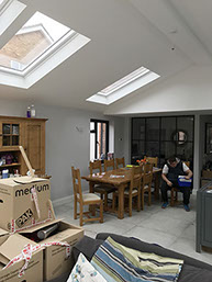 Single storey extension in Amersham with alluminum bifold doors internally a vaulted ceiling with 8 Velux windows to create a new kitchen/family room.